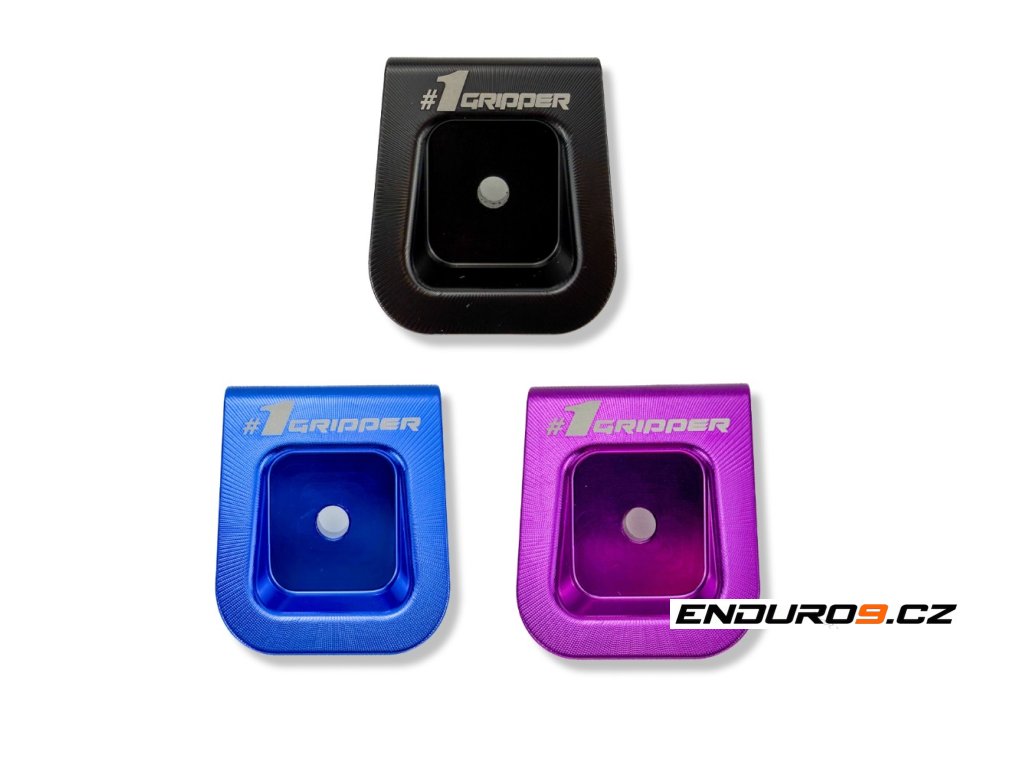 Originální plastová objímka se často láme. OneGripper nabízí alternativu z tvrzené hliníkové slitiny s eloxovaným povrchem. Výrobku vévodí logo #1GRIPPER.